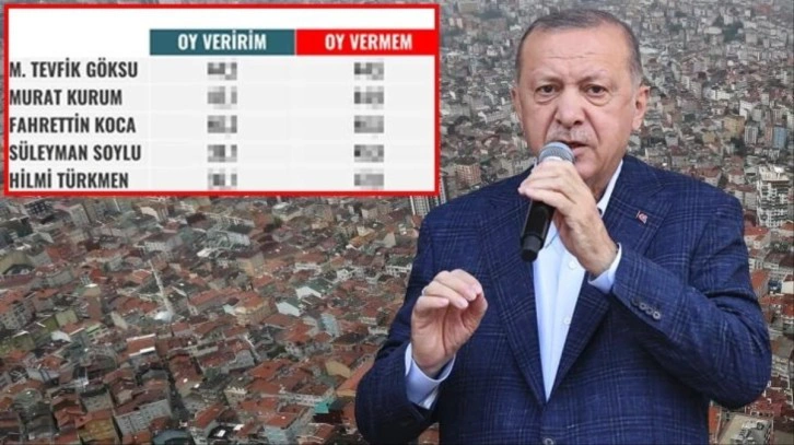 Göksu'ya "Oy veririm" diyenler yüzde 44.2 olurken, "Oy vermem" diyenler ise yüzde 44.5 oldu. Kurum'a "Oy veririm" diyenler yüzde 42.1 olurken, "Oy vermem" diyenler ise yüzde 44.9 oldu.Koca'ya "Oy veririm" diyenler yüzde 40.2 olurken, "Oy vermem" diyenler ise yüzde 46.5 oldu.Soylu'ya "Oy veririm" diyenler yüzde 38.7 olurken, "Oy vermem" diyenler ise yüzde 45.9 oldu.Türkmen'e "Oy veririm" diyenler yüzde 36.1 olurken, "Oy vermem" diyenler ise yüzde 47.8 oldu."İSTANBUL'U BUNLARIN ELİNE BIRAKAMAYIZ"
