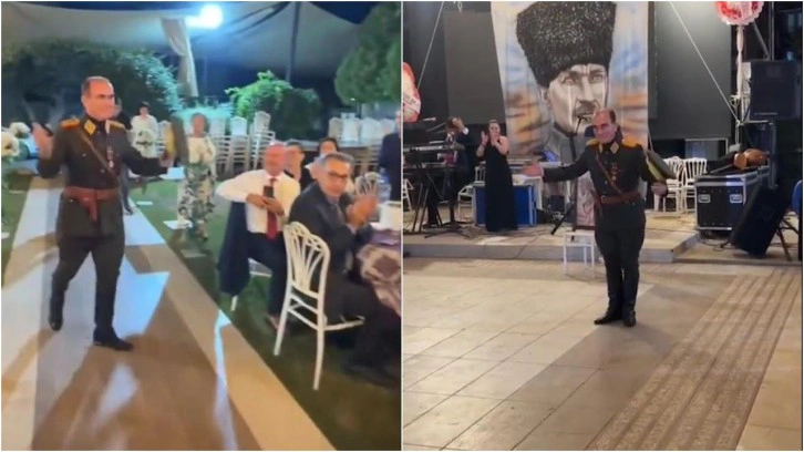 Milas ilçesindeki bir düğüne Atatürk rolünde katılan bir kişi, askeri kıyafetle misafirlerin karşısına çıktı.