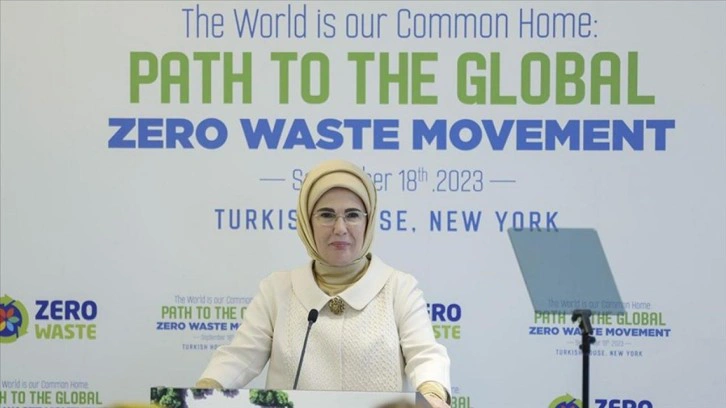 Emine Erdoğan, Türkevi'nde, devlet başkanı eşleri, BM'nin üst düzey yöneticileri, diğer ülke diplomatları ve New York Belediye Başkanı Eric Adams'ın hazır bulunduğu programda, "Küresel Sıfır Atık Hareketine Doğru" isimli etkinlikte konuştu.