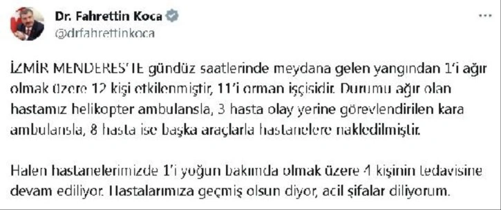 Bakan Koca, Twitter üzerinden konuya ilişkin yaptığı açıklamada, "İzmir Menderes'te gündüz saatlerinde meydana gelen yangından 1'i ağır olmak üzere 12 kişi etkilenmiştir, 11'i orman işçisidir. Durumu ağır olan hastamız helikopter ambulansla, 3 hasta olay yerine görevlendirilen kara ambulansla, 8 hasta ise başka araçlarla hastanelere nakledilmiştir. Halen hastanelerimizde 1'i yoğun bakımda olmak üzere 4 kişinin tedavisine devam ediliyor. Hastalarımıza geçmiş olsun diyor, acil şifalar diliyorum" ifadelerini kullandı.