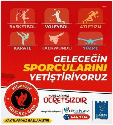 Özel Uğur İnan Kapalı Spor Salonu, Özertürk Stadyumu ve Kuşadası Eğitim ve Geliştirme Vakfı (KEGEV) bahçesinde gerçekleşecek olan Yaz Spor Okulları'nda eğitimlere 19 Haziran'dan sonra başlanacak. Ücretsiz kurslar için kayıtlar, Kuşadası Belediyesi Yeni Hizmet Binası içerisindeki Güvercin Masa başvuru masasından veya 444 71 14 numaralı çağrı merkezi üzerinden yapılacak. 2010-2016 yılı arasında doğan çocukların katılabildiği kurslar yaz sonuna kadar devam edecek.