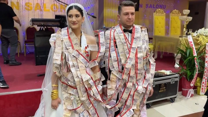 Damadın arkadaşlarınca çifte, 5 liralık banknotlardan oluşan 45 metrelik para zinciri takıldı.