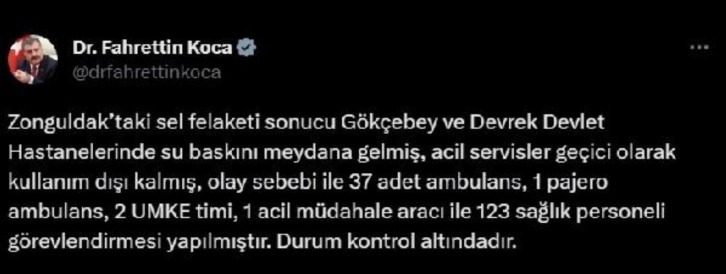 Bakan Koca, Twitter hesabından yaptığı paylaşımda, "Zonguldak'taki sel felaketi sonucu Gökçebey ve Devrek Devlet Hastanelerinde su baskını meydana gelmiş, acil servisler geçici olarak kullanım dışı kalmış, olay sebebi ile 37 adet ambulans, 1 pajero ambulans, 2 UMKE timi, 1 acil müdahale aracı ile 123 sağlık personeli görevlendirmesi yapılmıştır. Durum kontrol altındadır" ifadelerine yer verdi.
